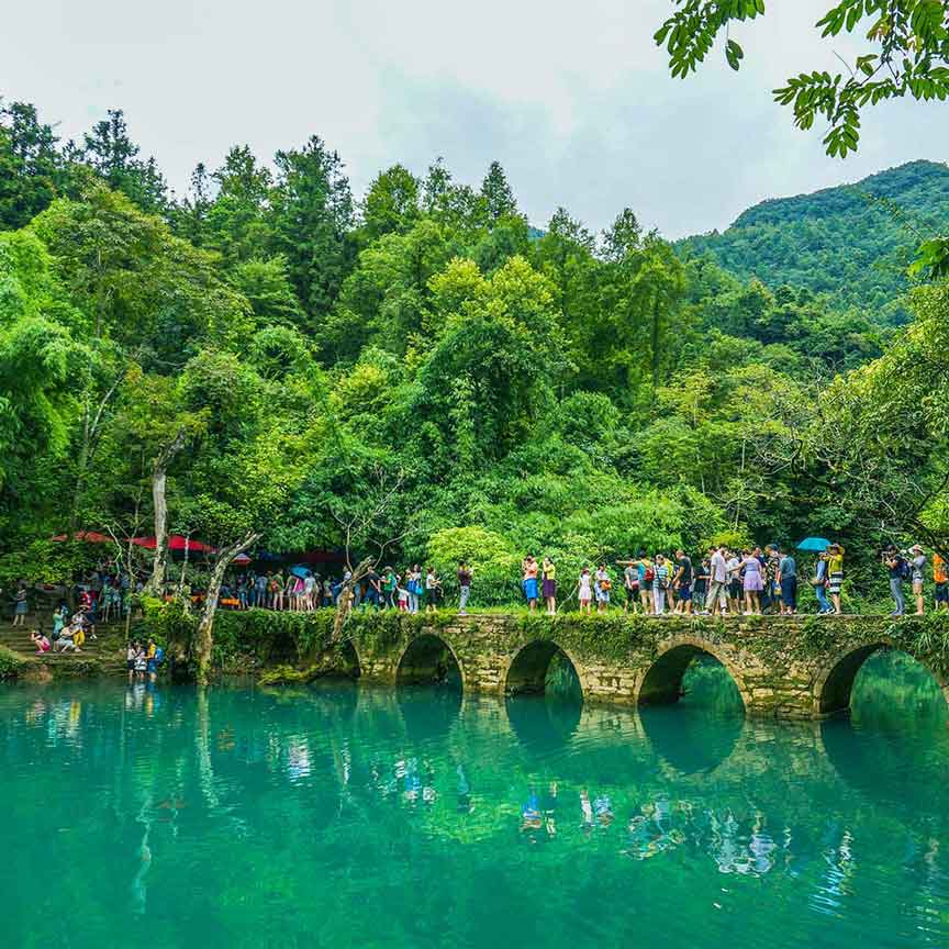 早餐后约7:00乘车前往被联合国教科文组织誉为“地球上同纬度的最后一颗绿宝石”的黔南荔波(车程约4小时),中餐后乘车(10分钟)抵达国家AAAAA级风景区【小七孔】,游玩时间:不少于3小时;景点之间需换乘电瓶车(必须自理电瓶车40元/人,景区保险10元/人)小七孔景区因一座建造于道光15年间(1836年)的小七孔石桥而得名;景区被称之为“超级盆景”,集山、水、洞、林、湖、瀑布等为一体,在长不到2公里的峡谷内,起迭着68级瀑布,顺贽而下,奔泻而去。拉雅瀑布精巧醉人,水珠飞溅;而长不到600米之水上森林,树根盘在错石上,清澈的水流冲刷着青石,行走于其中,若身临琼瑶仙池;(注:鸳鸯湖景区划船属景区内不必须自费项目,划船费30元/人)。