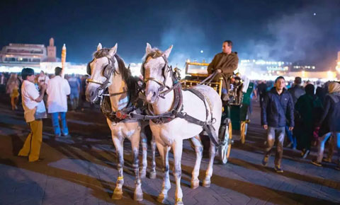 下午:午餐前往马拉喀什。外观库图比亚清真寺,来马拉喀什,必然是要来看看这座建于11世纪的清真寺,这里是马拉喀什老城的中心。非穆斯林没法进入清真寺内,所以这个景点最主要的看点就是清真寺的宣礼塔,宣礼塔是马拉喀什的制高点,甚至在哈桑塔之前,这座宣礼塔还是整个摩洛哥最高的建筑。宣礼塔又称“香塔”,因为它的建筑材料中混合了大量的香料。虽然历经千年,至今“香塔”仍有香气。后游览马拉喀什老城区自由活动,马拉喀什最具有魅力的建筑群体是老城区,以柏柏尔人的露天广场和集市为主。1985年联合国教科文组织将马拉喀什的老城作为文化遗产,列入《世界遗产名录》。特别安排既特色又复古的观光马车(4人一辆),带领你在马拉喀什老城穿梭,感受着马拉喀什老城文化。随后自由活动参观 不眠广场(游览时间约 40 分钟):从日出到深夜,你可看到印度的舞蛇人、出售香料茶叶的阿拉伯人、讲故事和算命的摩洛哥老人,各种卖艺的表演,还有数不清的买卖食品、饮料、服饰、地毯、摆设、皮革、手工艺品小摊位,它就像香港的兰桂坊、上海的新天地一样,因为有此广场,马拉喀什有了无穷生命力