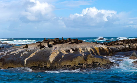 乘船出海前往【海豹岛】,在海中央光秃秃的礁石上聚居着成千只软毛海豹。