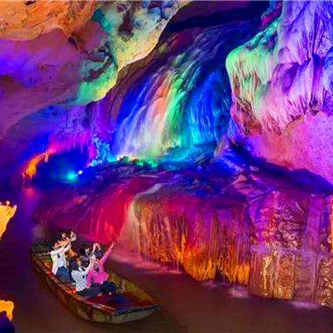 15:00 餐后前往游玩【洞天仙境】(游览时间约1.5小时),景区地处闻名遐迩的“南天第一峰林”, 素有“华南第一天坑”之称,是英西峰林走廊的核心景区。以其独特的喀斯特地貌、沟壑险峻的地理特征为依托,融山、水、石、潭、钟乳、瀑布、天桥、天坑、绿洲为一体。泛舟天坑,两岸钟乳林立,石笋如画,晶莹斑斓, 七彩水影天幕,天然白玉观音像,穿越“亚洲首创-溶洞悬空玻璃栈道”、徒步“穿天悬空栈道”更能突显出大自然的鬼斧神工与人类智慧的相结合,沿河景观达一百余处,各具特色,是一个集“天坑奇观、度假住宿、汤泉养生、休闲娱乐、特色美食、野外拓展”的原生态综合型旅游景区。
