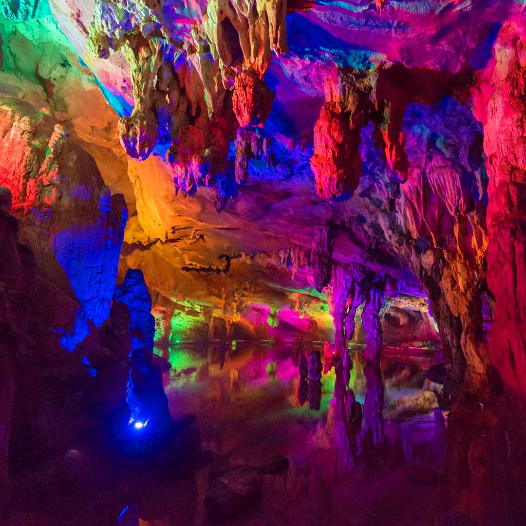09:30 游览目前广东省巳开放的溶洞中规模最大的一个,著有“岭南第一洞天”之称的【宝晶宫溶洞】【狮子山天梯】【飞龙观景台】【天宫玻璃桥】【游船30分钟】,景区主要由宝晶宫溶洞、碧落洞、天鹅湖、狮子山、英石园、摩崖石刻群六部分组成。1996年,广东省考古所就在洞内古河道一处沙砾石层中发现距今十万年以前的旧石器。距溶洞1.2公里的碧落洞洞壁上保存有一百二十多则摩崖石刻,蕴含着深厚的道教文化,现为省级文物保护单位。走进溶洞,里面高大宽阔、雄伟壮观,石笋、石柱林立、石花、钟乳石千姿百态;洞内有一百多个石景,形态逼真、惟妙惟肖;有的象花鸟虫鱼、有的象飞禽走兽、有的象天池飞瀑、还有的象神仙佛祖……千奇百怪、形象万千,整个洞穴如同宫殿般的美丽。(游船团队统一安排浏览,景区将优先安排可坐30人的大船,如大船已经派出,不够大船时将安排4-8人一条的小船,坐小船需要交押金,大船有景区工作人员开船,小船游客需要穿救生衣,且为游客自已开船,全部为电动船)